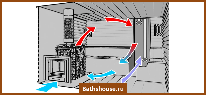 Поток, поступая в сауну, моментально начнет нагреваться, тесня горячие воздушные массы к потолку и в сторону вытяжки.