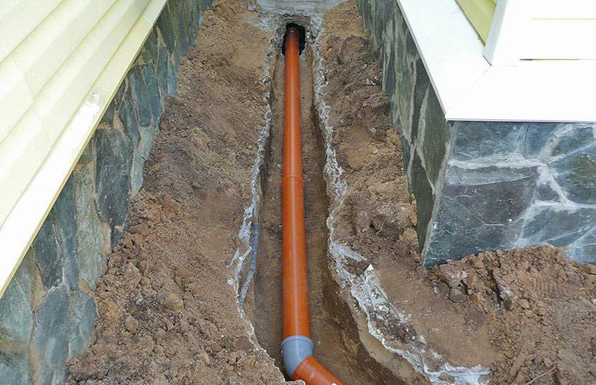 Труба под уклоном прокладывается на глубине промерзания почвы или ниже (зависит от региона, средняя глубина от поверхности составляет 70-80 см). При необходимости, утепляется вспененным полиэтиленом либо минеральной ватой (поверх защищается пластиковым коробом от сырости).
