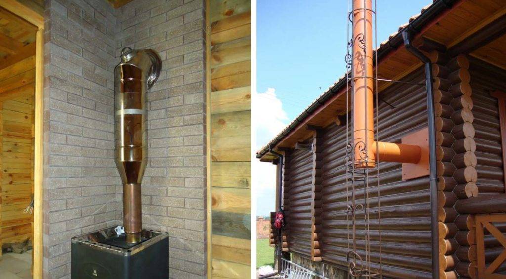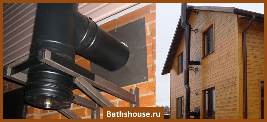 Конструкция дымохода полностью монтируется через стену, и заступает над баней, но в самой бане не занимает место.