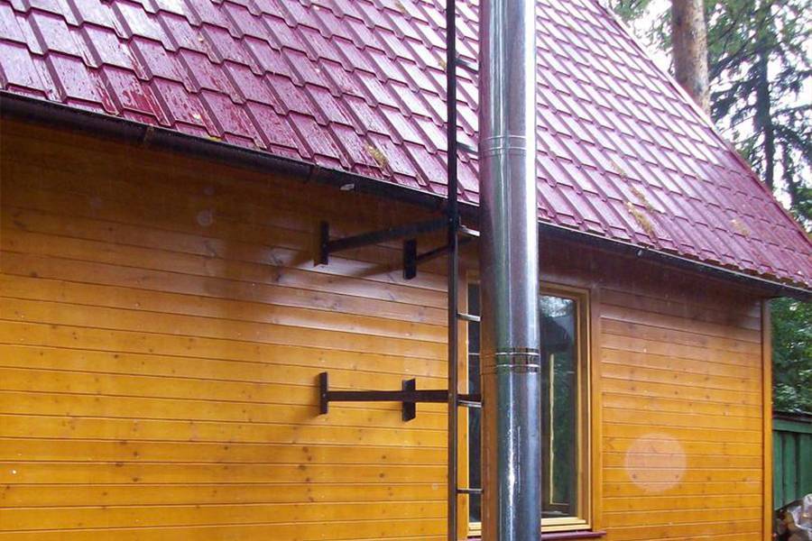 Дымоход через потолок и крышу бани проходит через защищенные отверстия. Одно из главных условий безопасности людей в отапливаемом здании – нагрев конструкций крыши, потолка и стен вблизи трубы до температуры не выше 50 °C. Требования пожарной безопасности к установке дымоходов изложены в СП 7.13130.2013. Отопление, вентиляция и кондиционирование. Требования пожарной безопасности.