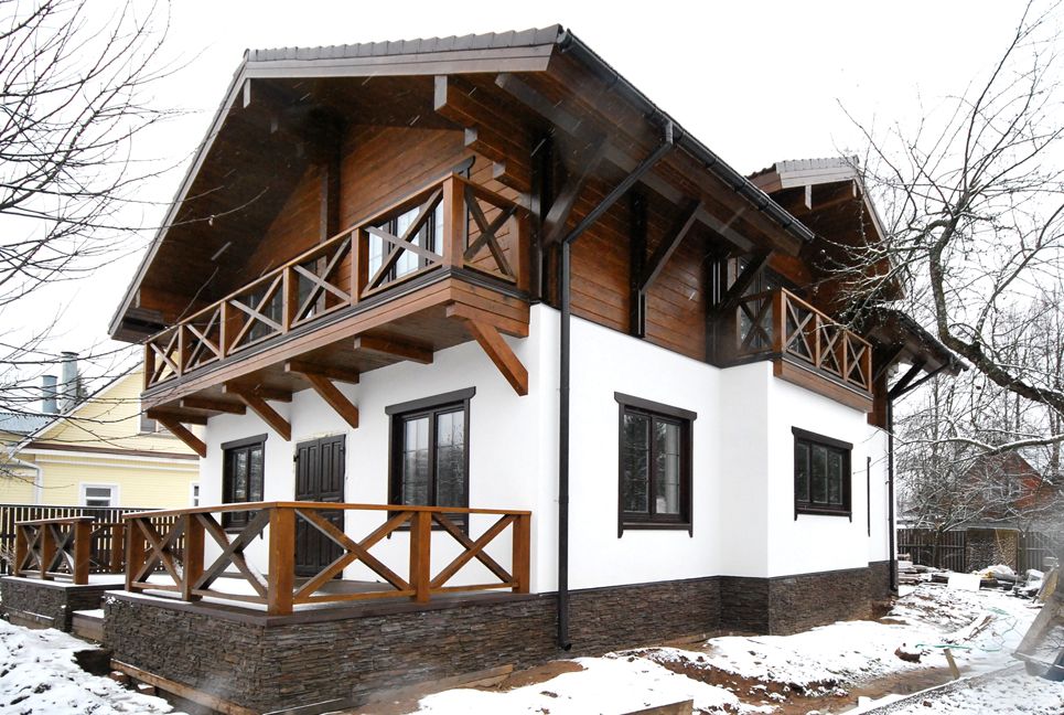 Швейцарский вариант комбинированного дома — это шале (в переводе «сельская хижина»). Исторически шале служило убежищем для пастухов и домашних животных от непогоды, и конструкция таких строений была самая незамысловатая. Нижний уровень выкладывался из каменных глыб, иногда затирался известью. Верхний возводился из дерева, что надежно защищало от ветра и стихии. Крыши были максимально наклонными, чтобы на них не скапливали осадки. Эти черты шале и перенеслись в новейшие технологии строительства комбинированных домов. Современные шале могут выполняться из кирпичей и дерева. Чтобы придать им традиционный колорит, углы и цоколь оформляют камнем, дополняют декор фактурной штукатуркой. Для верхних этажей используется клееный брус или бревно. Последний этаж — обязательно мансардный, со скошенным потолком, ведь крыши шале по традиции покатые, выступающие на несколько метров от стен. Гармоничным дополнением к зданию служат террасы, которые свойственны этому типу строений.