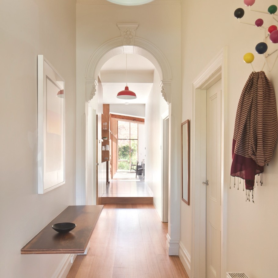 Коридор выполнен в белоснежном цвете, разбавлен только деревянными элементами и картинами. Благодаря ярким деталям нет монотонности. В ванной так же используется деревянная отделка, что позволило отказаться от стандартных понятий об этой комнате. Своеобразная планировка жилья и дизайнерские идеи позволили красиво и удобно совместить минимальное количество материалов.