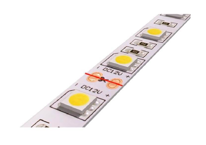 Для сохранения работоспособности всех сегментов светодиодной ленты разрезать ее нужно только в предусмотренных для этого местах ленты. Если разрезать в любом месте ленты между светодиодами, то светодиоды из разрезанного сегмента LED ленты работать не будут.