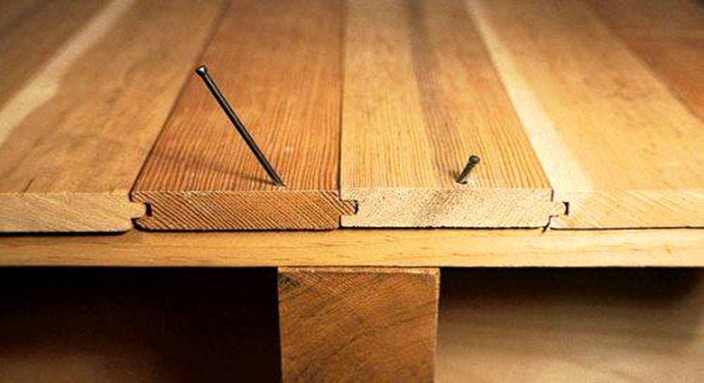 Половицу, расположенную непосредственно около стенки, кладут на лаги с обязательным 1-сантиметровым промежутком, укрепляют саморезами под углом к поверхности. Когда отверстия от гвоздей целые, можно применять их. Далее методом соединения «шип-паз» выполняют укладку еще нескольких досок.
