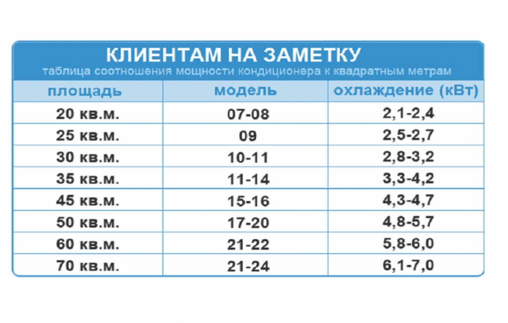 Если обобщить параметры мощности, то классифицировать кондиционеры в зависимости от квадратуры помещения можно будет так: