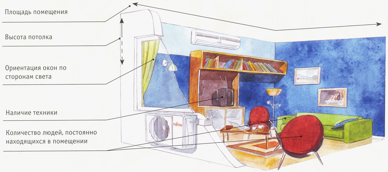 Если рассматривать обычную пустую комнату, то в таком случае подобрать мощность кондиционер по площади довольно несложно. Как это можно сделать, было описано выше. Однако существуют некоторые факторы, которые усложняют процесс подбора подходящего климатического оборудования. Если комната жилая, в ней есть бытовые приборы, то тогда без учета дополнительного поступления тепла в помещение обойтись не получится.