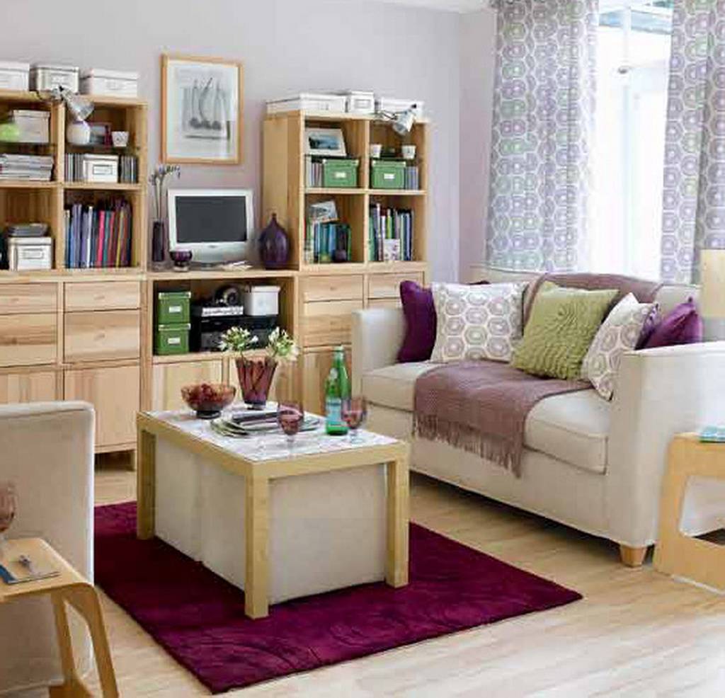 Оригинально будут смотреться небольшой ковер в интерьере гостиной, имеющий вид островка, который можно положить около кресла, телевизора, входа на балкон