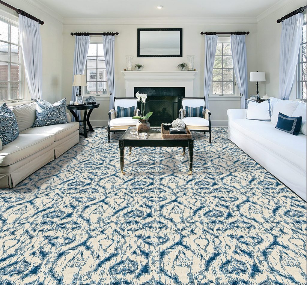 - Скролл. Плотно расположенные к друг другу нити создают плотную поверхность. Они выстригаются на разную высоту, за счет чего формируется рельефный рисунок. Такие ковры называют еще скульптурными или структурными. Смотрятся шикарно, но есть сложности с уходом. Если гостиная/зал у вас «парадные» — этот вариант для вас. Если нагрузка на ковер будет выше средней, он быстро потеряет привлекательность.