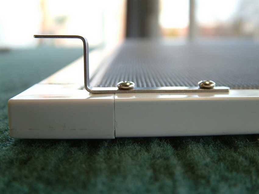 Сетку можно крепить с помощью металлических z-образных уголков, которые обеспечивают удобное и надежное использование и не требуют дополнительных отверстий в раме. Однако такое соединение не создает надлежащего прилегания сетки к раме, оставляя небольшие зазоры для насекомых.