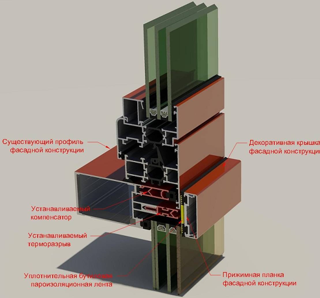 Оставшиеся вертикальные элементы утепляют специальным термоизоляционными вставками (термомост, терморазрыв), герметизируют, после чего закрывают декоративными накладками.