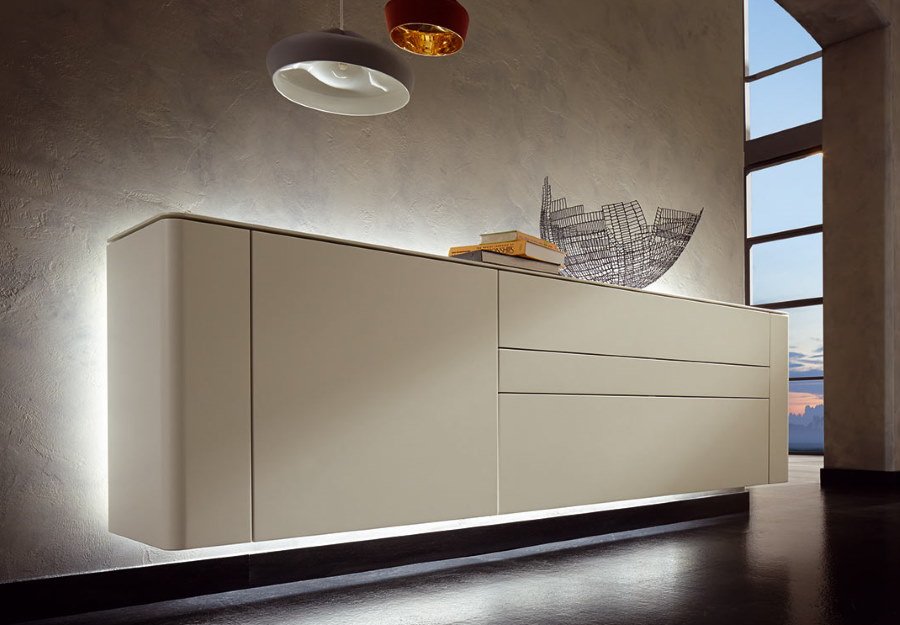 Подсветка – это не только украшение, но и вполне удобный функционал. Часто ее делают в комодах в стиле хай-тек.