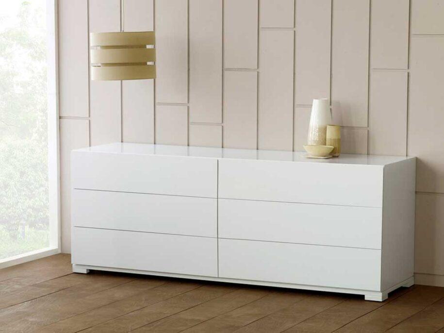 Для воплощения стиля хай-тек стоит подобрать комод с глянцевой поверхностью и современной фурнитурой. К примеру, ящики изделия открываются с помощью несильного нажатия на фасад благодаря применению системы открывания push/pull.