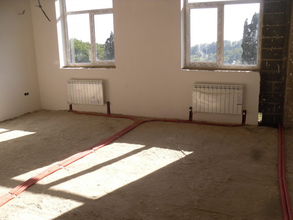 При устройстве водяного обогрева есть два варианта – монтаж теплых полов или сооружение радиаторного отопления. Второй вид обогрева имеет существенное преимущество перед теплыми полами. Монтаж радиаторов и трубопроводов выполняется быстрее и проще, чем устройство контура в стяжке пола.