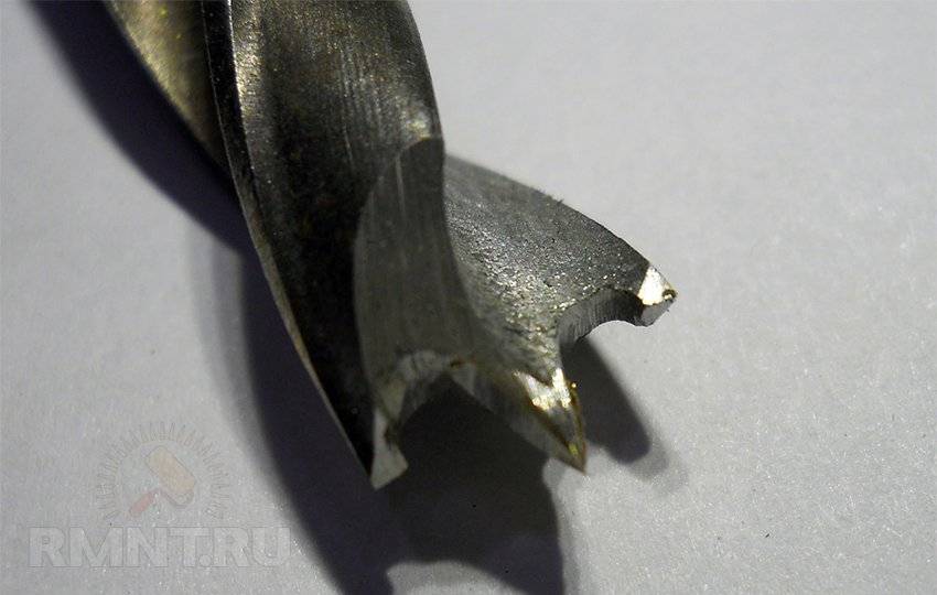 Имеет направляющий шип и два конуса, образованные заточкой краёв кромок. В другом варианте кромки могут быть без угла, с минимальной площадью контакта. Такое сверло не разрывает край листа при сверлении и не застрянет в отверстии.