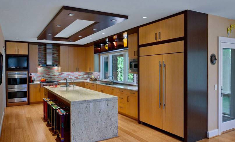 Необычно в интерьере кухни будут смотреться двухцветные одноуровневые потолки, при помощи которых помещение делится на зоны. Использованием нескольких различных цветов, пространству кухни можно задать конкретные функциональные зоны.
