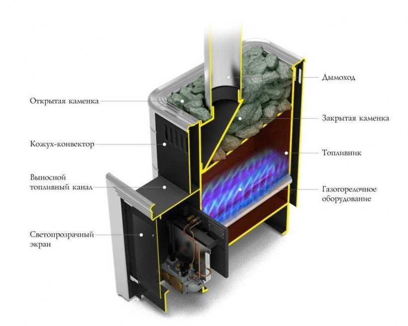 Сегодня конструкции печей есть разные. Независимо от материала, из которого изготовлена печь, в самом простом варианте в нижней части топки горят дрова, а в верхней находятся банные камни. Пламя нагревает камни, которые отдают тепло воздуху. Сегодня в любой печи для бани, даже газовой и электрической, есть каменка — место, где уложены камни. Потому часто печи для бани и сауны называют просто каменками: без них это уже обычный отопительный агрегат.