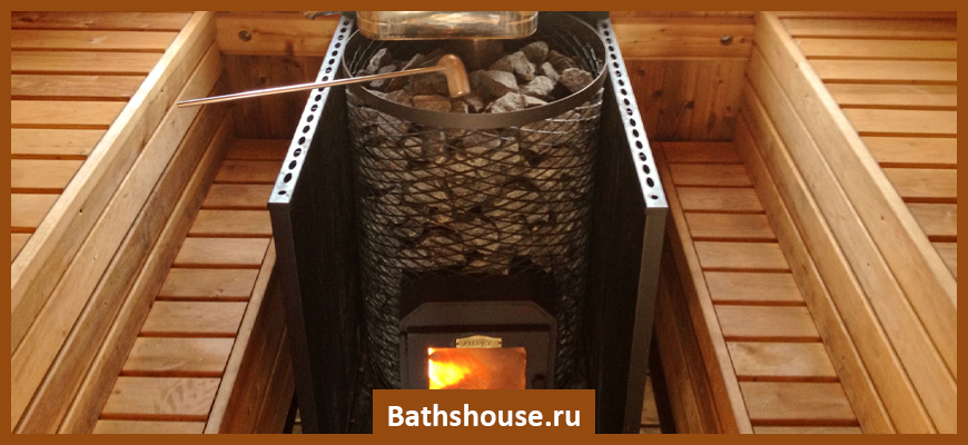 Вокруг корпуса печи устраивают сетку. При таком варианте масса закладываемых камней может быть даже более 100 кг. Так как камней много, пока не прогреются, они отбирают значительную часть тепла. Это увеличивает время прогрева парилки. Но с другой стороны, они закрывают раскаленные стенки топки, жар становится более мягким.
