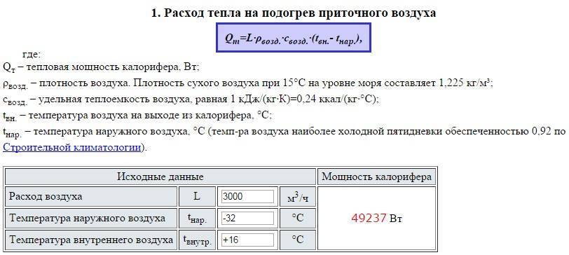 Поскольку расход воздуха известен из характеристик вентиляционной системы, то вычислять его не потребуется. Формула определения тепловой мощности прибора: