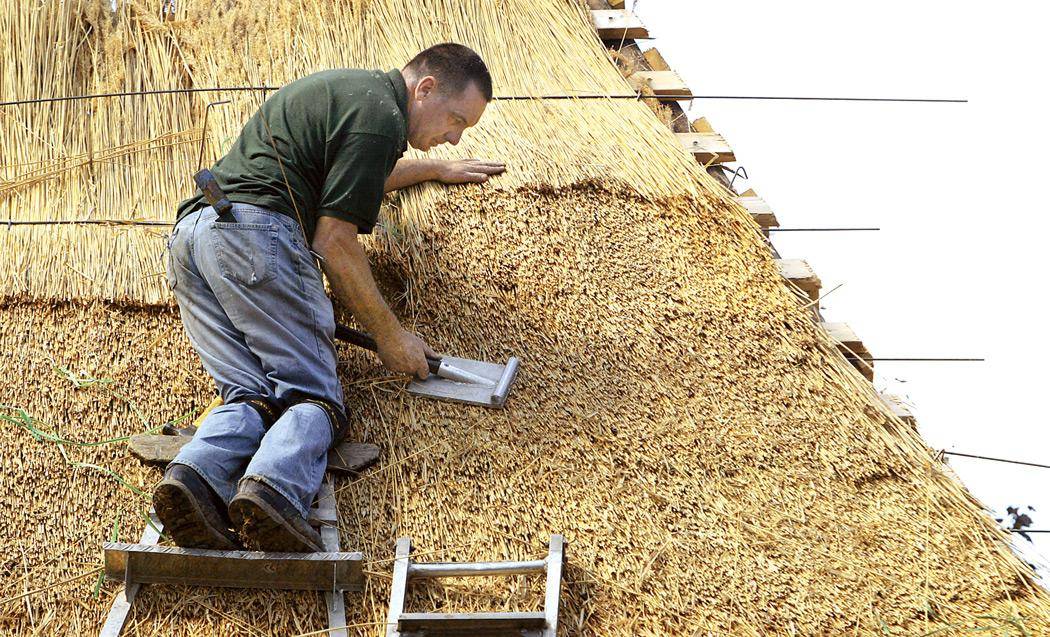 В современном строительстве отдают предпочтение первому методу обустройства камышовой кровли. В рядах растение прошивают стальной проволокой, саморезами крепят к обрешетке. Когда все снопы уложены на крышу, их аккуратно «причесывают», разравнивают с помощью вил и лопаток.