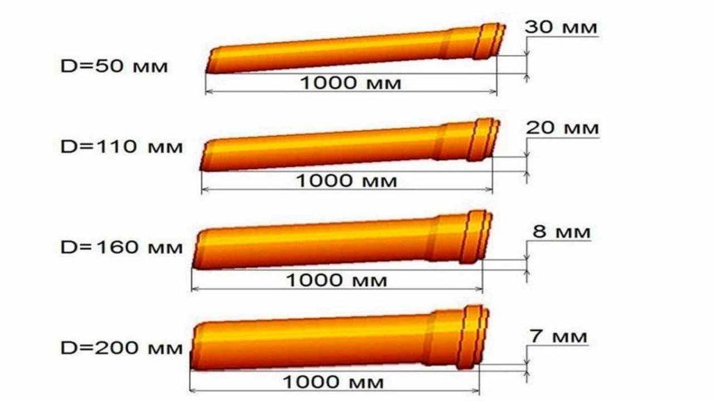 - при расчете минимально возможного угла наклона учитывается диаметр используемых труб: Ø 40-50 мм – 0,03 ¡ , Ø 85-110 мм – 0,02 ¡. В формуле «¡» это возвышение одного конца трубы длиной в 1 метр над другим. В данном случае, 2 и 3 см соответственно;