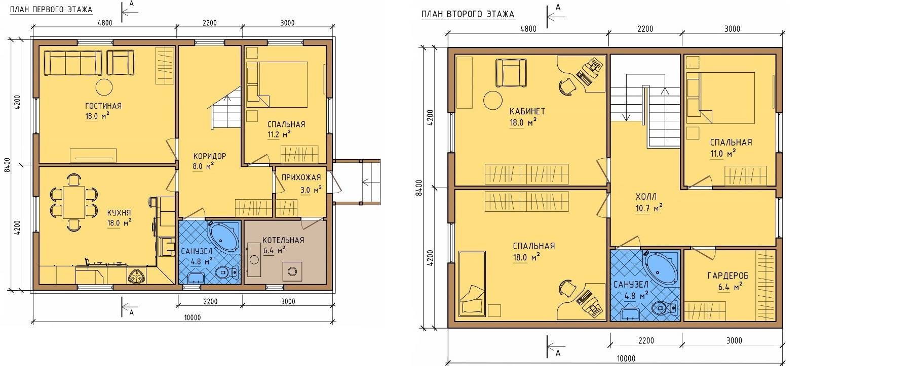Более просторный дом 8х8 м расширяет возможности. На 1-м этаже можно оборудовать санузел и пару комнат, а на втором — спальни, кладовые и даже полноценную лоджию. Значит, это строение будет уже не дачным, а полновесным жилым. Только для проживания зимой вам потребуется дополнительно изолировать потолки и стены качественным утеплителем толщиной не менее 150 мм. Сооружение 8х8 уместно накрывать 2-скатной крышей.