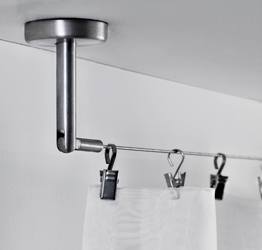 Конструкции из стальных струн. Данное изделие имеет небольшую себестоимость, может крепиться как на потолке, так и на стене. В душевой комнате, струнный карниз можно установить перпендикулярно для занавешивания душа. Длина стальных нитей струны может достигать 5 м и более. В кронштейне допускается крепление нескольких струн для штор, ламбрекенов и тюлей. Следует учитывать их способность растягиваться, поэтому не желательно подвешивать тяжелые шторы. Со временем струны могут немного провисать, для этого существует регулирующий механизм системы натяжения. Рекомендуется, при первичной установке струн, не обрезать полностью оставшийся кусок струны, оставив несколько сантиметров для регулировки;