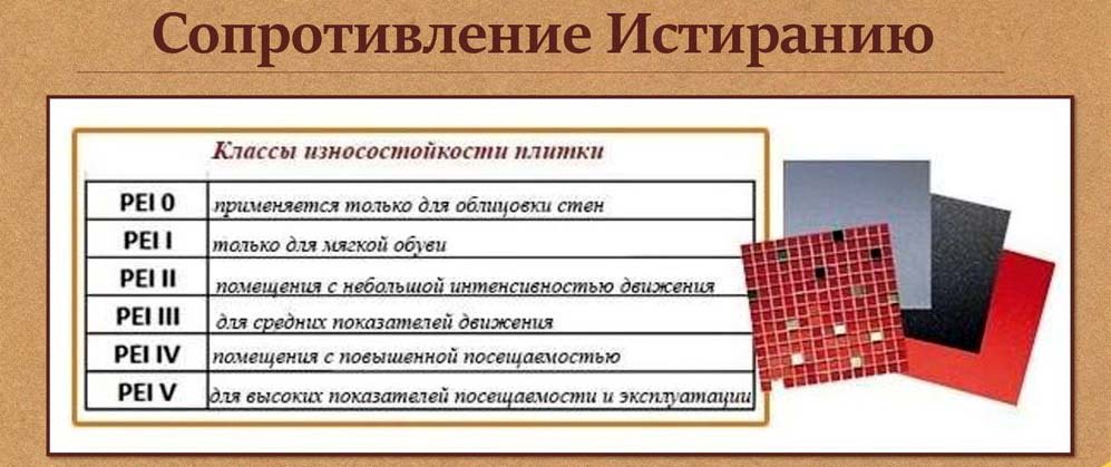 Сопротивляемость истиранию измеряется по шкале PEI, которая проградуирована пятью классами:
