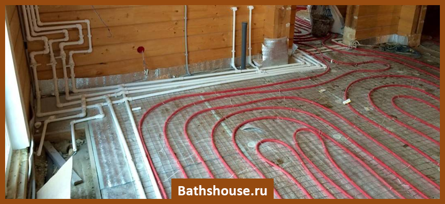 В разных комнатах бани оно может отличаться. Например, в парилке чаще всего делают проливные полы. Для этого организуют черновой настил еще до возведения стен, после монтажа фундамента. Обязательно учитывают особенности стока и забора воды. Все эти и другие коммуникации прокладывают постепенно в процессе строительства, учитывая нюансы и особенности строения. Если в парной пол предполагается каменный, то организуют уровень наклона и отверстие для слива. Тоже делают в душевой. В комнате отдыха под кафель можно установить систему тёплого пола.