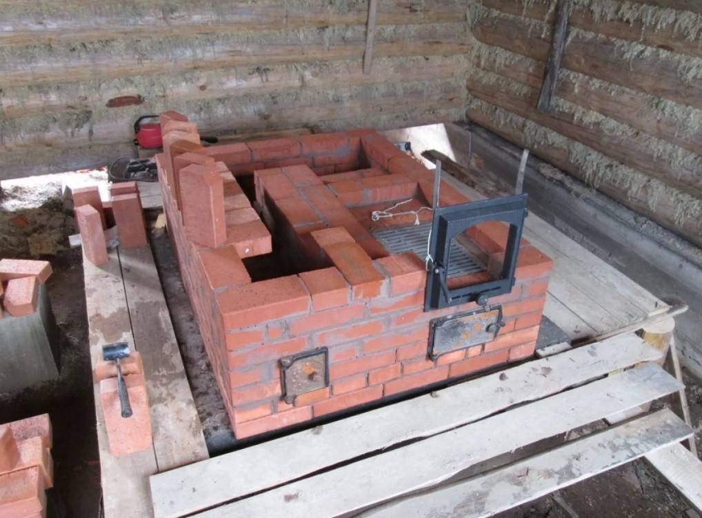 Чтобы устроить в бане кирпичную печь с каменкой, выбирают место в парной с учетом размеров. Самые распространенные варианты – 3,5х4 кирпича (в плане 89х102 см) или 4х5 кирпичей (102х129 см). Обязательно обеспечивают противопожарный отступ от стенки печи до горючих конструкций бани не меньше 40 см. Топочную дверцу обычно выпускают в предбанник.