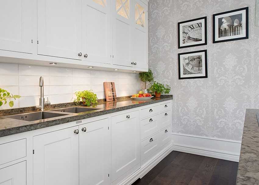 На представленных фото обоев для кухни в классическом стиле представлены удачные идеи декорирования интерьера с помощью светлых и темных материалов для стен.