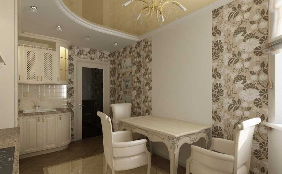 Для отделки комнаты в выбранном стиле кафель не подходит. Оптимальным решением станут нежные обои для кухни с подходящими орнаментами. Они помогут визуально увеличить помещение.