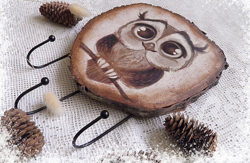 - Настенной. Располагается на стене у входной двери, в зоне непосредственного доступа и обзора. Это не только привычные крючки, но и настоящие произведения декоративного искусства из фанеры, решения, выполненные по технологии декупаж.