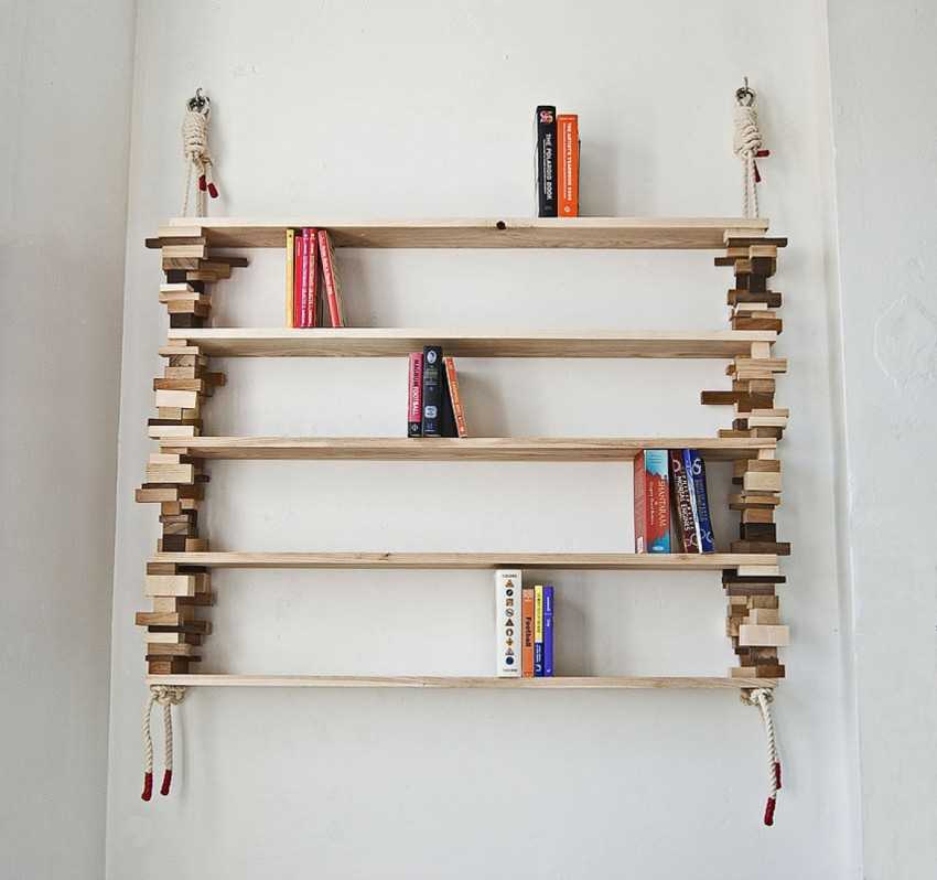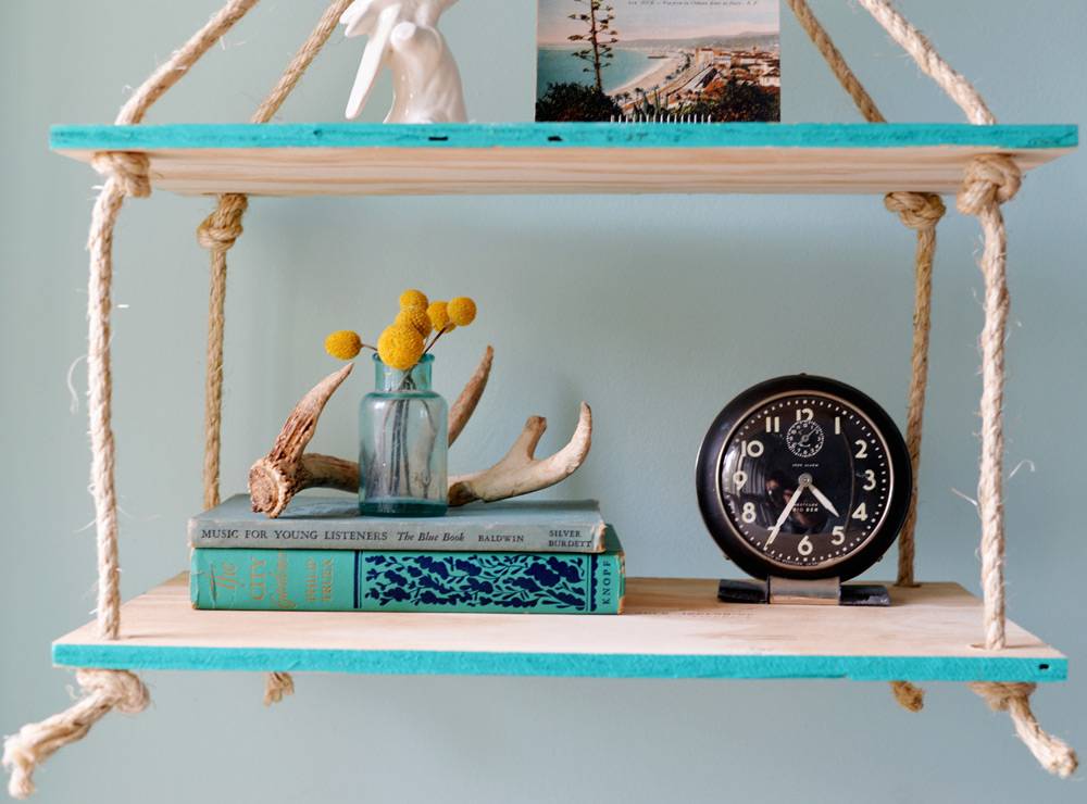 Вы можете немного поэкспериментировать со способами крепления веревок и своими руками сделать не только полки, но даже подвесные стеллажи.