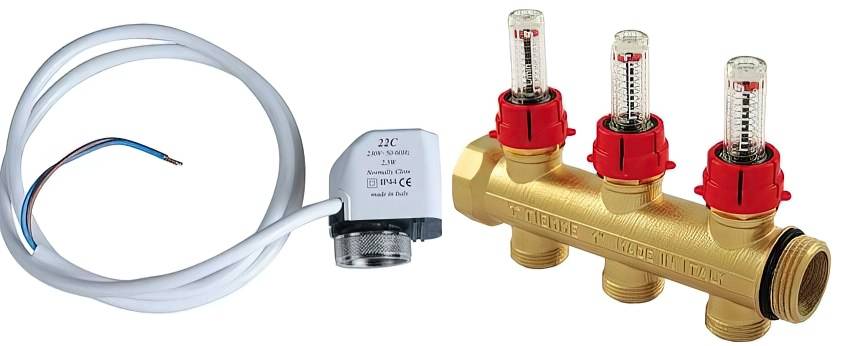 Такой вариант неплох, но регулировать расход, а значит, и температуру приходится вручную. Это далеко не всегда удобно. Для автоматизации регулировки на входах ставятся сервоприводы. Они работают в паре с комнатными термостатами. В зависимости от ситуации, на сервопривод подается команда закрыть или открыть поток. Таким способом поддержание заданной температуры автоматизируется.