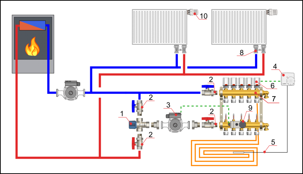 Более холодная вода берется из обратки теплого пола. Смешиваясь с горячей водой поступающей из котла, теплоноситель и приобретает пониженную температуру, необходимую для напольного отопления.