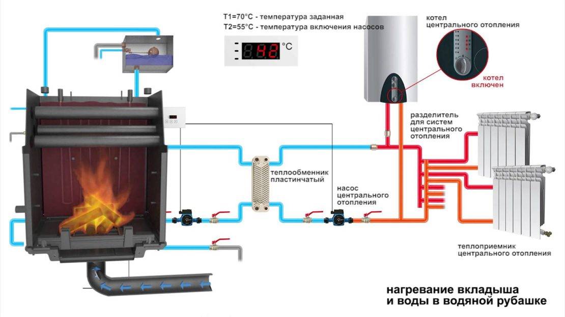 То есть, вы, сделав вечернюю закладку дров, можете спокойно отправляться спать. Примерно через 4-5 часов, когда температура теплоносителя начнет снижаться, к нагреву подключится электрический ТЭН, который будет поддерживать нужную температуру.