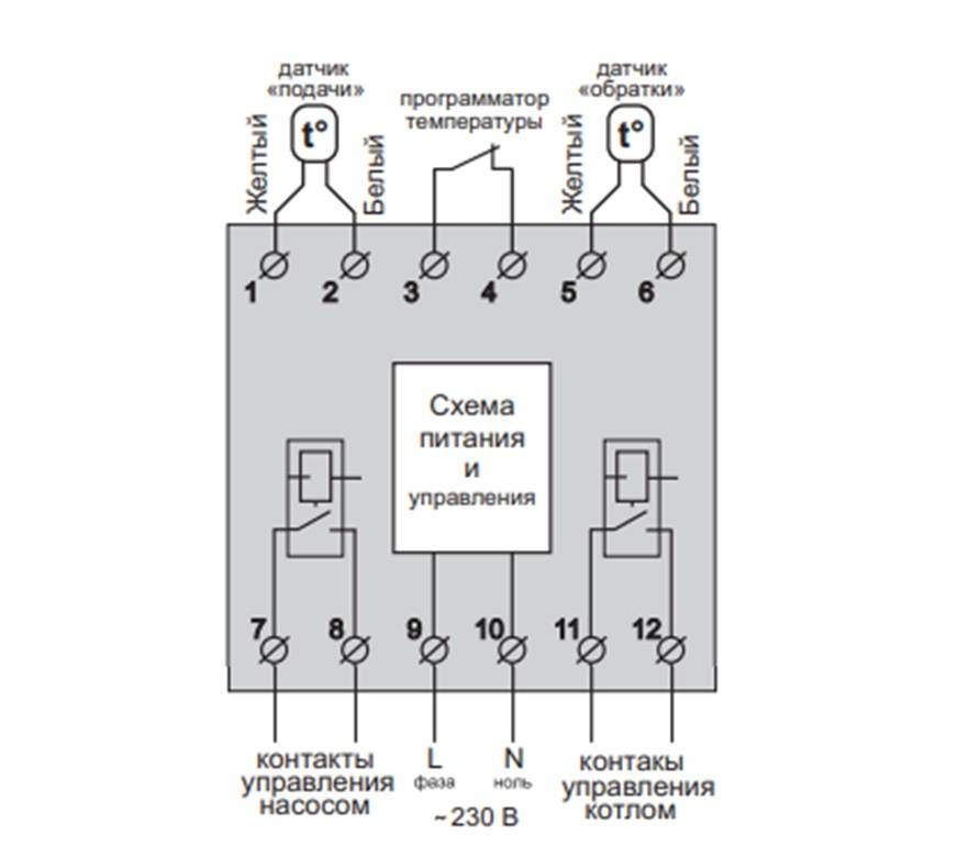 Как правильно подключить термостат BeeRT к котельному агрегату? В соответствии со схемой 1 питающее напряжение 230 Вольт, подают к клеммную колодку 9 (фаза L) и 10 (ноль N). От клеммников , осуществляется управление циркуляционной насосной установкой, а 11, 12 — нагревательными деталями (ТЭНами) котла. Датчики температурного режима жидкости подключают следующим способом: