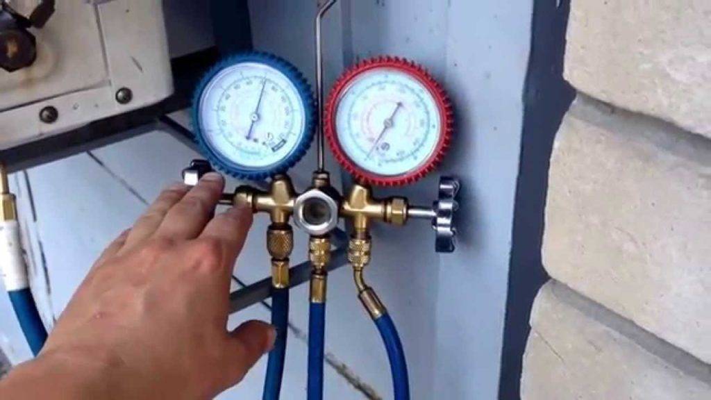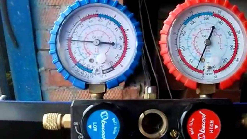 Сначала нужно подсоединить манометр к газовому порту работающего на охлаждение кондиционера. Рабочее давление прибора должно быть 3-3,5 атм. Если оно ниже этих отметок, то требуется дозаправка. Для этого подключают баллон с фреоном и небольшими порциями начинают заправлять его в систему путем открывания кранов на манометре на 5-10 секунд.