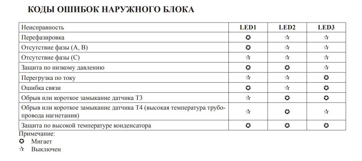 Коды ошибок внешнего блока отображаются индикаторами LED1, LED2 и LED3.