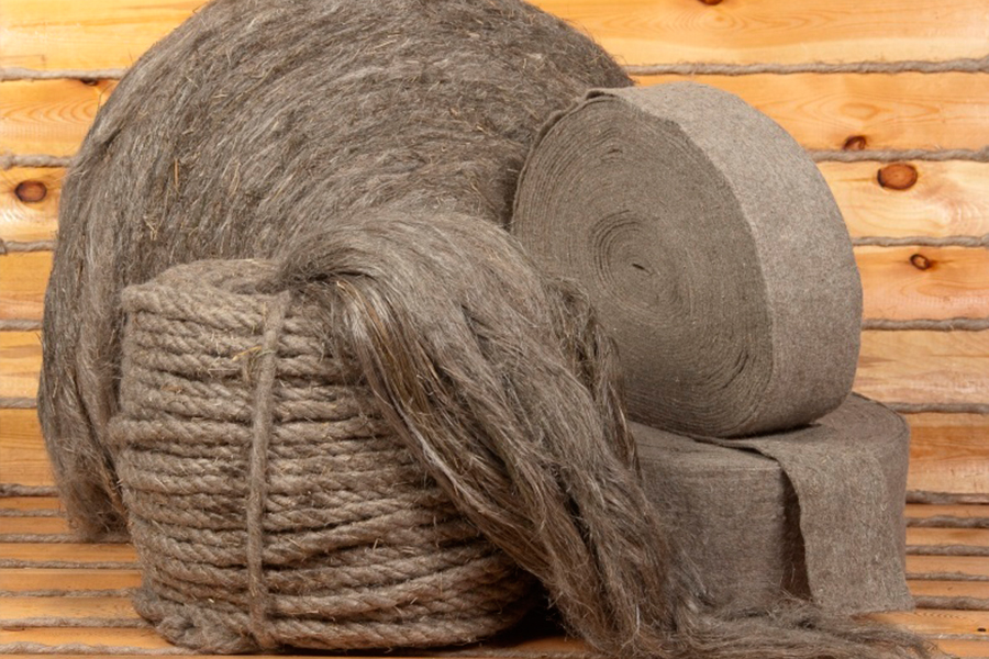 Обработка джутом тоже хорошо подходит для бани, так как этот экологичный материал сохраняет природные свойства и безопасность дерева. Это волокно отличает высокая прочность, теплоизоляция, устойчивость к влаге и гниению. Рулонный материал с ровной структурой легко укладывать между венцами. Однако джут часто становится местом для размножения моли, поэтому перед применением рекомендуется обработать материал средством от моли.