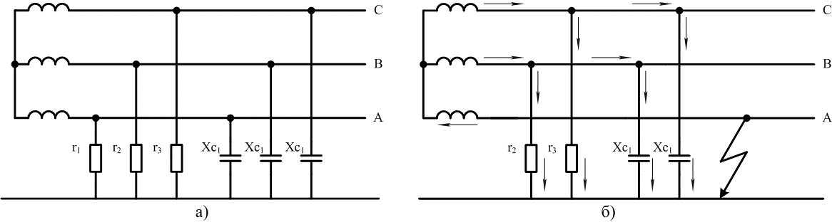 Рисунок 1 – Схема сети с изолированной нейтралью а) в нормальном режиме; б) при ОЗЗ