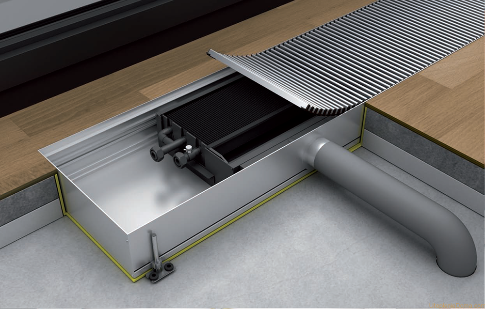 - Внутрипольные конвекторы устанавливаются в специальные ниши в полу, а сверху закрываются прочными решетками. Они аналогично подключаются к разводке труб, которая прокладывается в стяжке пола на этапе ее монтажа.