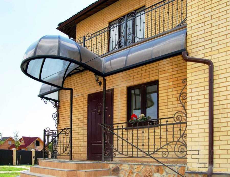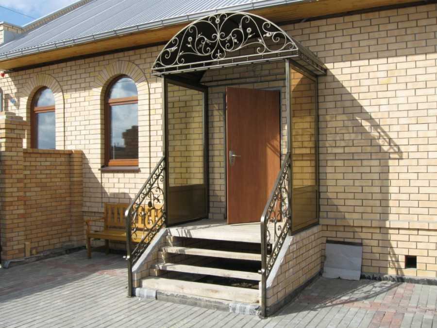 Козырьки выполняются различными по форме, его длина делается не менее 85-100 сантиметров, ширина должна превышать размеры дверного проема на 40-60 см. В качестве дополнительной защиты от погодных явлений, конструкция оснащается боковыми стенками.