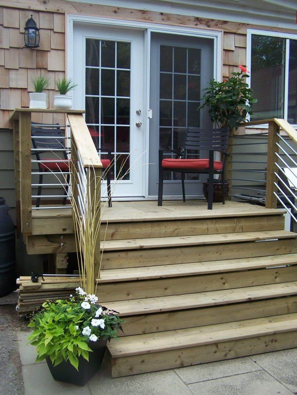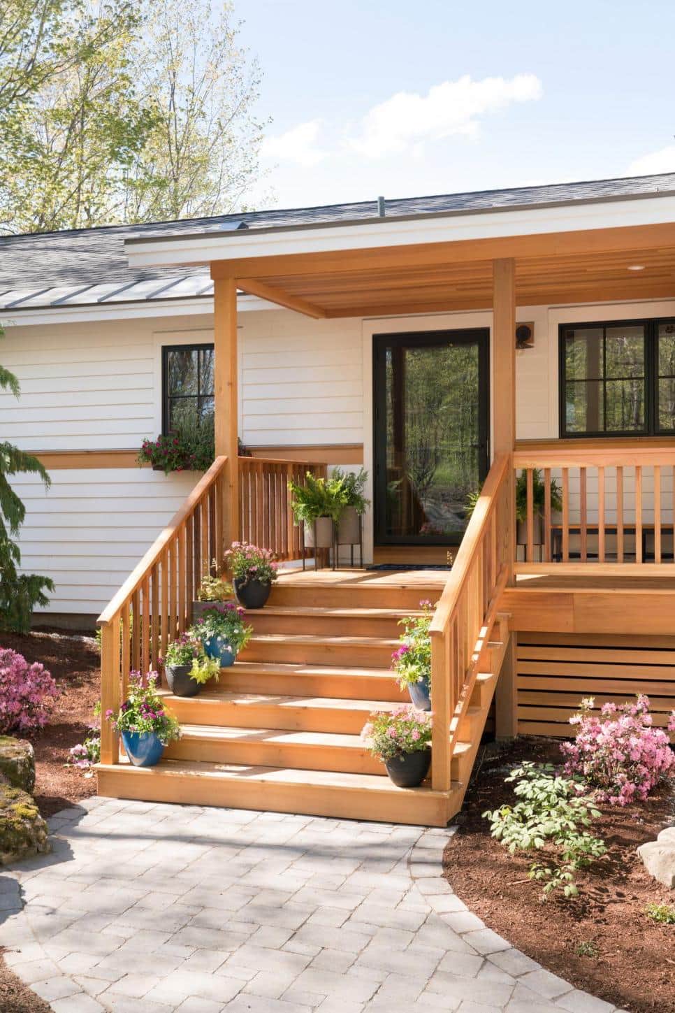 Ступени из сосны могут быть дополнены перилами, можно обустроить особую площадку для отдыха, на которую поставить кресла, зелёные насаждения, декор. В последнем варианте крыльцо будет уже напоминать небольшую террасу.