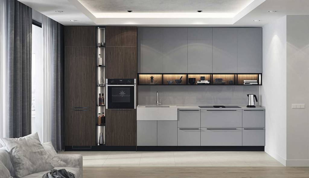 - Линейная/однорядная (подходит для квартиры-студии, для узкой, небольшой площади. Но мало места на готовку, для дополнительных приборов, техники);