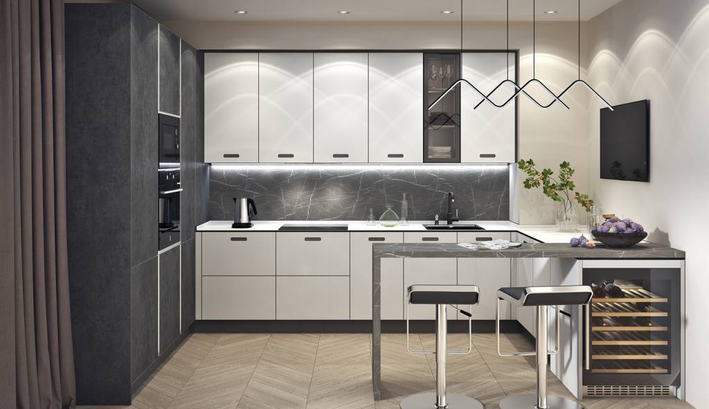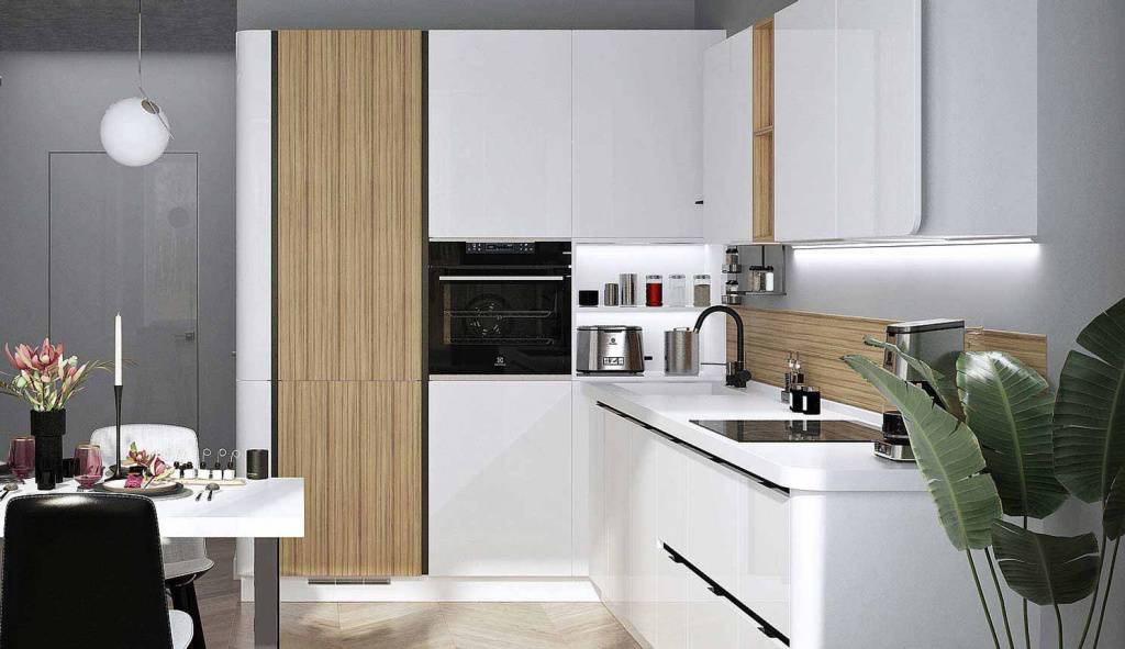 - L-/Г-образная (предусматривает функциональный подход к делению пространства, появляется больше свободного места для готовки, мойки, хранения. Подходит для большинства помещений, но не для узких, больших);