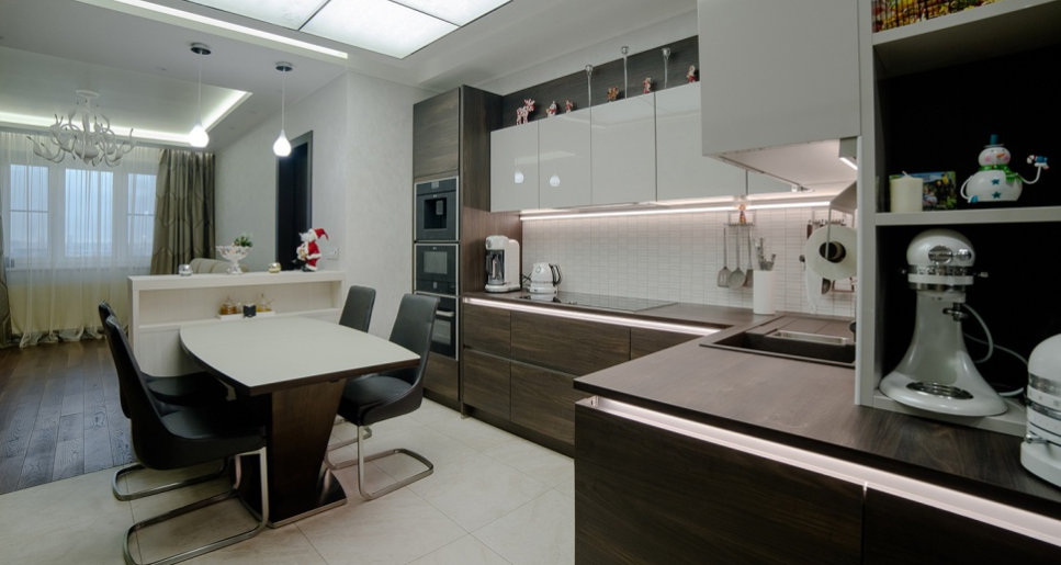 Если на кухне есть ниши, сделайте в них светодиодную подсветку. Аналогичным образом преобразите рабочую зону. С помощью ярких полос из светодиодов вы разнообразите лаконичную цветовую палитру помещения.
