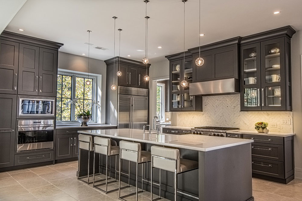 На этом фото видно, как удачно можно организовать освещение на кухне, оформленной в стиле модерн. Украсьте зону для приема пищи подвесными световыми приборами со стальным декором.