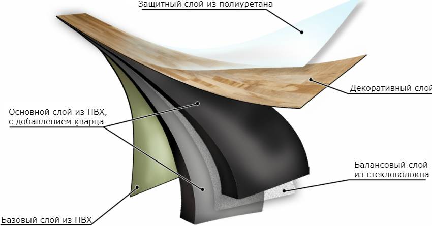 - кварц винил, который является основным слоем и придает изделию необходимую прочность;
