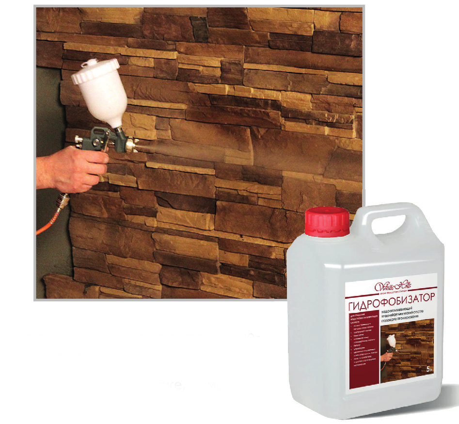 Перед тем как обработать искусственный камень из гипса лаком, следует нанести на поверхность гидрофобный состав. Его водоотталкивающая текстура позволит защитить поверхность от излишней влаги и нежелательной плесени. Раствор не образует пленки и проникает в гипсовый материал на глубину в 20 мм. Покрываем поверхность декоративного камня из гипса гидрофобным составом в несколько слоев, один за другим, не дожидаясь, когда каждый подсохнет. Обрабатывать плитку необходимо с обеих сторон.